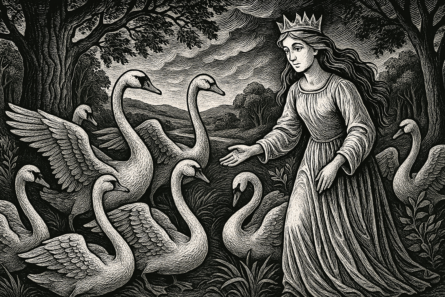 Elisa este o prințesă tânără și blândă, crescută alături de cei unsprezece frați ai ei. Toți se înțeleg foarte bine și trăiesc în liniște alături de tatăl lor, regele. După un timp, regele se recăsătorește cu o femeie care, deși pare frumoasă și liniștită la început, ascunde un suflet rece și crud. Noua regină îi alungă pe băieți și o trimite pe Elisa la țară, sperând astfel să o îndepărteze și să rupă legătura copiilor cu regele.